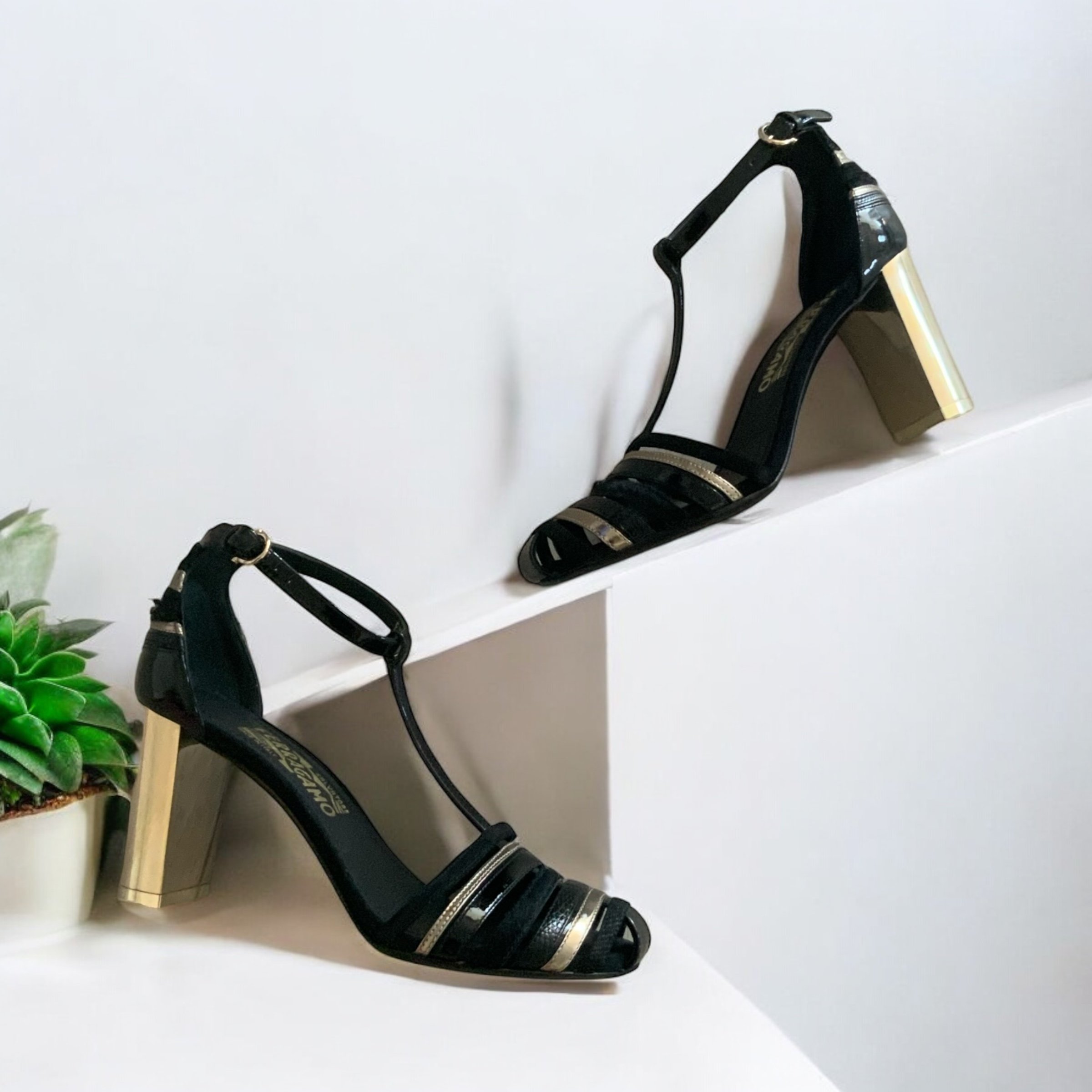 Gold-tone block heel, adjustable ankle strap, suede, & leather upper, heel approximately 3”, rounded toe.